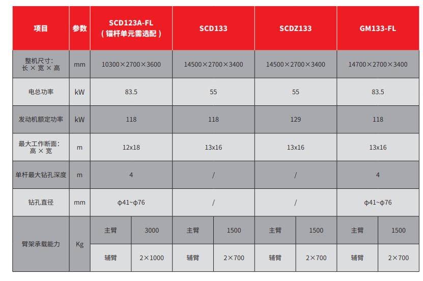 | 臂架最大承载能力 | Kg | 拱架臂 | 2×1200 | 拱架臂 | 2×2000 | 主臂 | 3000 | 主臂 | 4000 |