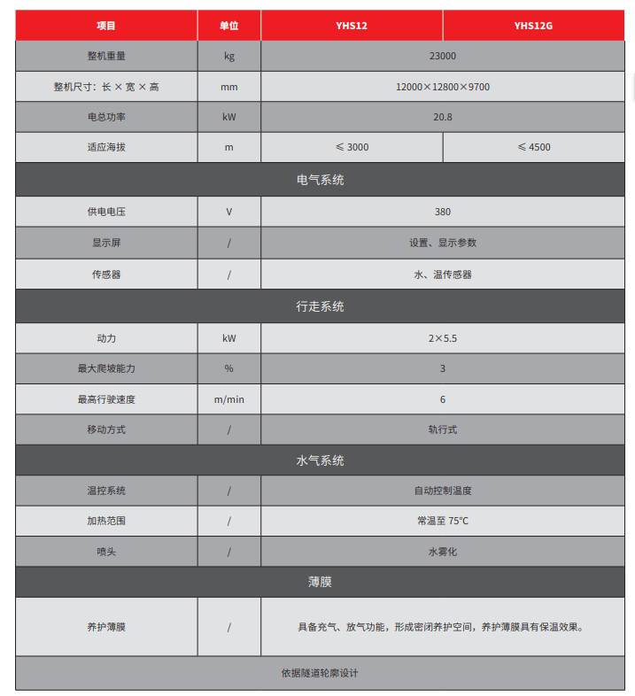 YHS12数字化养护台车是隧道用养护设备,通过恒温水箱、密闭保温系统、雾化系统、检测控制系统,实现二衬混凝土的恒温恒湿养护以及自动控制养护。可广泛应用于铁路、公路、水路等领域各种隧道施工中的混凝土养护作业。