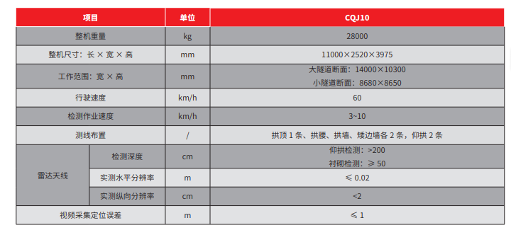 CQJ10车载式隧道衬砌质量检测车是隧道衬砌检测领域的重要设备,实现对二衬完成后衬砌厚度、衬砌背后回填密实度、衬砌内部钢筋分布情况等项目机械化、信息化检测功能,可用于高速铁路隧道贯通、衬砌与填充层施工作业完成后,道床施工作业前的隧道衬砌质量检测及运营状态下公路隧道衬砌内部病害检测。
