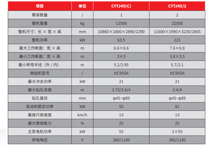 钻臂具有升降和偏摆的液压平动功能,方便钻孔过程中快速定位,有效保证掏槽孔的平行度;采用高强度和轻量化钻臂结构,保证钻臂运动灵活,定位精准快速;采用双底部结构高强度推进梁结构,有效保证钻孔直线度;钻臂动作由电比例阀块控制,优化控制曲线,保证微动功能的平顺 ( 仅 CYTJ45 系列智能型 )。